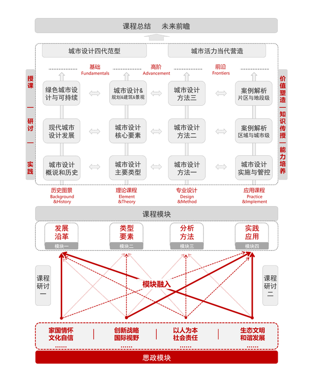 《现代城市设计方法》是由王建国院士、徐小东教授等领衔的城市设计团队共同打造的国家级课程思政示范课程,是面向建筑学、城乡规划、风景园林一级学科研究生开设的专业必修课。根据学校培养领军型专业人才的需求与课程教学定位,针对城市设计多元交叉的学科属性,提出“强专业方法、重案例实践、融思政元素、育自主创新”的总体课程思政教学指导思想。授课内容主要覆盖了城市设计概念与内涵、城市设计发展历史沿革、类型与要素,以及城市空间的分析研究方法、城市设计的操作分析技艺和实践案例分析等,旨在促进学生了解城市设计的概念及其与建筑、规划等相关学科的关系,帮助学生掌握相关核心方法与关键技术,充实相关专业技术能力和知识,树立正确的科学观与价值观。