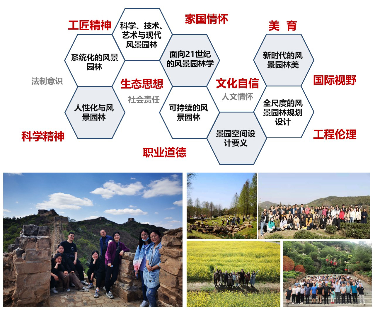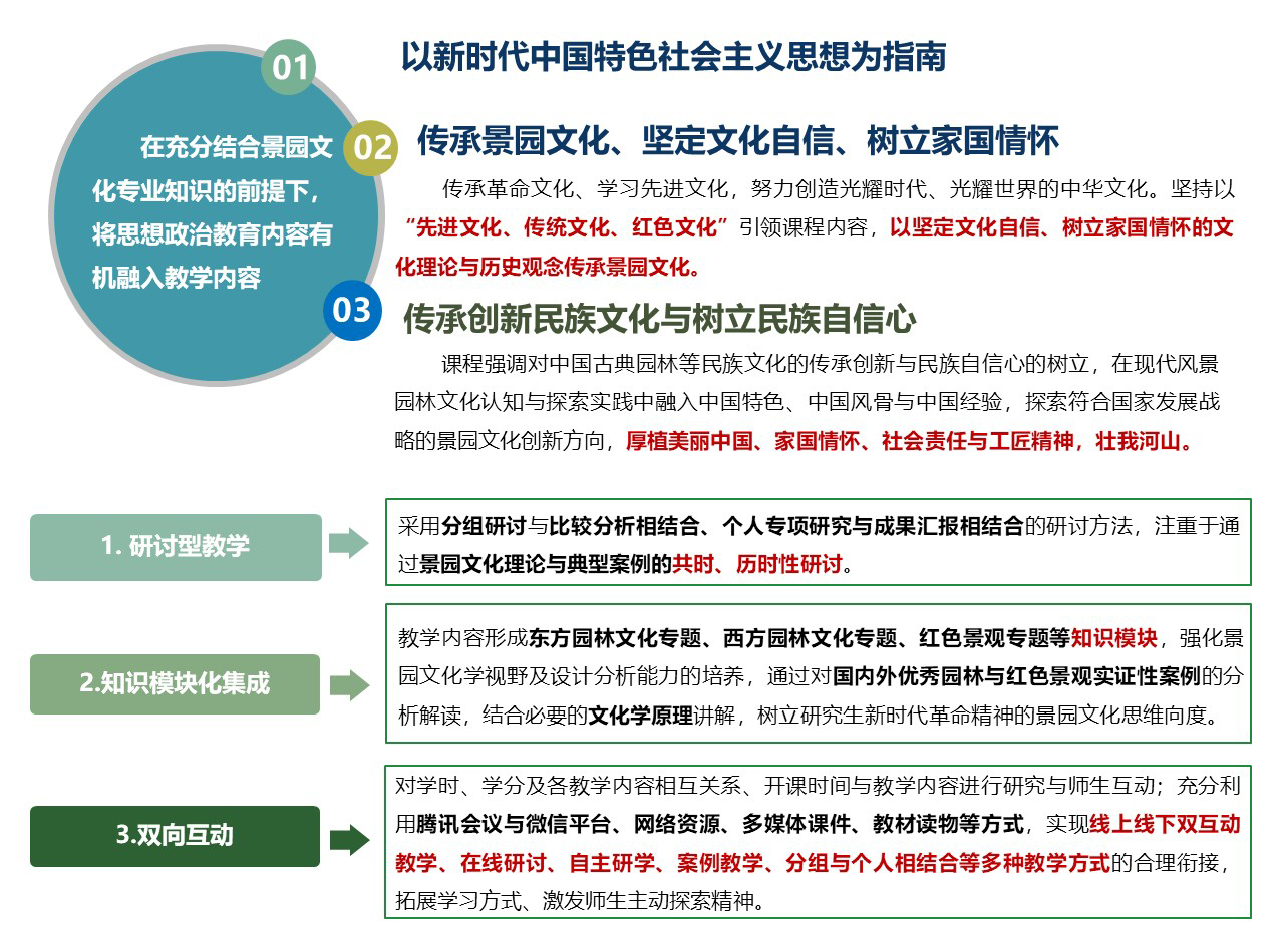 课程坚持以国际视野、中国特色、前沿意识的风景园林文化理论与研究方法引领课程内容,以坚持民族自信、家国情怀的历史理论与遗产保护研究传承景园文化,以世界优秀景园案例与文化景观解析强化思想阵地与教学优势。教学内容围绕价值塑造、能力培养、知识传授三位一体的课程建设目标,筑牢知识模块与家国情怀、文化自信、人文关怀、工程伦理、工匠精神等社会核心价值观文化元素的“触点”和“融点”,强化典型案例的教学运用。课程结合景观文化理论基础讲授,梳理当代景观文化研究体系,厘清景观设计中文化观念的动态变迁与发展趋势,深入解析当代景观设计思潮与应对策略,促进学生主动运用景观文化学的理论角度进行具体分析与实践;通过景观设计历史与人文思潮的共时性比照分析,梳理景观文化发展历史进程与文化规律,进而把握风景园林设计中应用人文思维进行设计的基本原则、方法和技术;通过一定的国内外景观设计典例研究,结合必要的文献阅读与实践调研,使学生充实分析能力,强化设计能力,扩充景园知识体系。课程获2021年成人色情 研究生课程思政示范课程建设项目立项并获评“优秀”,相关教学内容纳入2021年教育部“主题案例”并于全国高校思想政治工作网“育人号”报道。