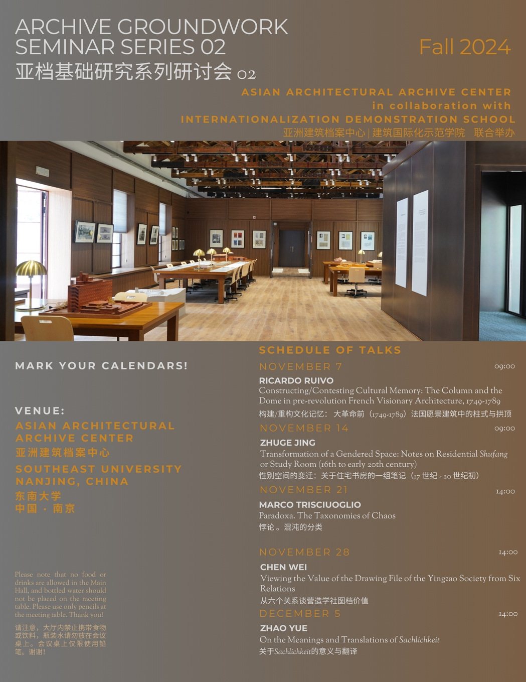 In Spring 2024, the Asian Architectural Archive Center (AAAC) at Southeast University, in collaboration with the Internationalization Demonstration School (IDS), launched a series of seminars utilizing the materials housed at the AAAC. These seminars aim to cultivate new ideas, establish foundations for future research, advance research practices and enrich teaching through the study of the AAAC’s collections and participation in group discussions. In line with the primary goals of the seminar series, the contributors are invited to draw inspiration from the books and other materials housed at the Archive. Presentations ofwork-in-progress research are encouraged, with the aim of further developing ideas through collective dialogue and contributions from the seminar participants.